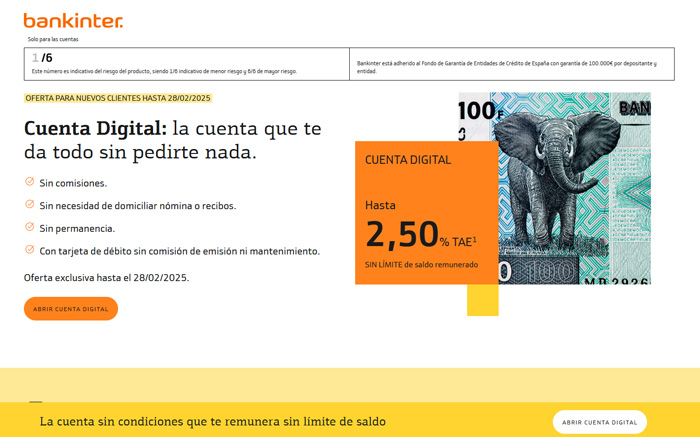 Esta promoción está dirigida exclusivamente a nuevos clientes que contraten la Cuenta Digital a través de la web o la app de Bankinter antes del 28 de febrero de 2025. No se requiere domiciliar nómina ni recibos, y no existen condiciones adicionales para disfrutar de la remuneración.