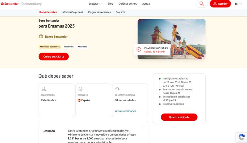El periodo de solicitud de la Beca Santander Erasmus 2025 está abierto desde el 16 de enero hasta el 30 de abril de 2025 a las 23:59 horas. Es fundamental completar la inscripción dentro de este plazo para ser considerada en el proceso de selección. La evaluación de todas las solicitudes presentadas tendrá lugar hasta el 16 de junio de 2025, fecha en la que se comenzará a comunicar a los solicitantes si serán o no beneficiarios de esta ayuda económica.