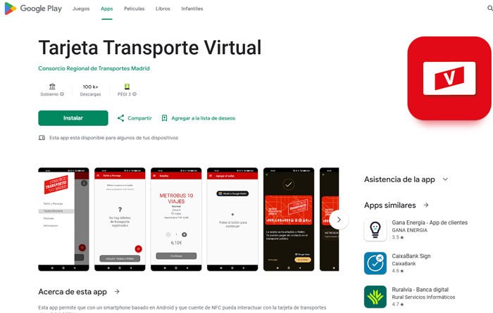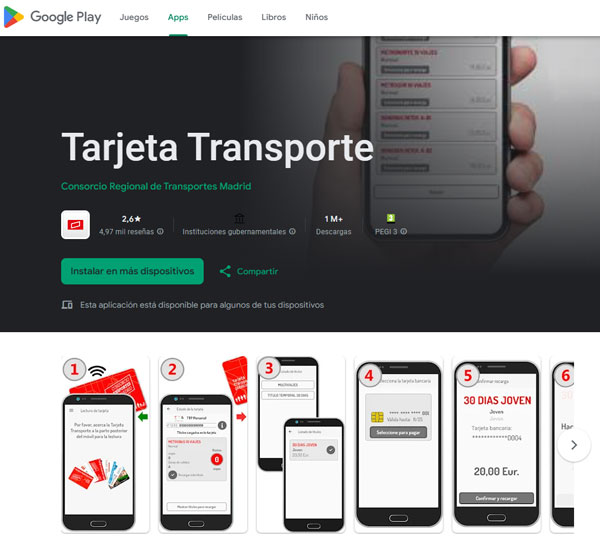 Si acudes a la tienda de aplicaciones Google Play y buscar ‘Tarjeta Transporte Madrid’, te aparecerán dos apps. En la llamada ‘Tarjeta Transporte’, también disponible para iOS, podrás recargar tu título y consultar el saldo disponible, pero no podrás validar tu viaje en los tornos del Metro o antes de subir al autobús.
