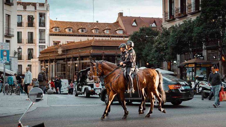 Los caballos de la Policía Nacional se preparan para soportar sin alteraciones estruendos y situaciones extremas en su trabajo diario. Según informa el propio cuerpo, este adiestramiento comprende prácticas con detonaciones de armas de fuego real, gases lacrimógenos, petardos, bengalas, lienzos de colores, obstáculos, helicópteros o cualquier otra circunstancia para la que deban estar entrenados.