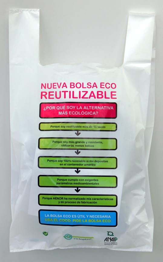 La Asociación Española de Industriales de Plásticos (ANAIP) ha presentado la nueva Bolsa ECO, la alternativa de la industria a las bolsas de un solo uso. Esta bolsa se ha desarrollado a lo largo de los últimos dos años y ha sido normalizada por AENOR a través de la norma UNE 53.942/2009, garantizando unas características estándar y que su proceso de fabricación cumple con exigentes parámetros medioambientales.