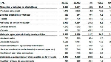Cada hogar destinó otro 14,4 % de su presupuesto (4.241 euros) a Alimentos y bebidas no alcohólicas, porcentaje similar al de 2006. En cambio, el presupuesto destinado a Transportes (3.530 euros) representó el 12,0 % del total, 2,7 puntos menos que en 2006. También han reducido su peso en el presupuesto medio de los hogares los gastos en Artículos de vestir y Mobiliario. Desde 2006 los hogares han recortado el presupuesto destinado a cada uno de estos tres grupos en una quinta parte. En la interpretación de la siguiente tabla hay que tener en cuenta que las variaciones del gasto tanto al alza como a la baja pueden deberse a variaciones en los precios o en las cantidades consumidas. Por ejemplo, el aumento del gasto en tabaco se debe a la subida de su precio, mientras que el gasto en alquiler está influido por el aumento de los hogares con ese régimen de tenencia.