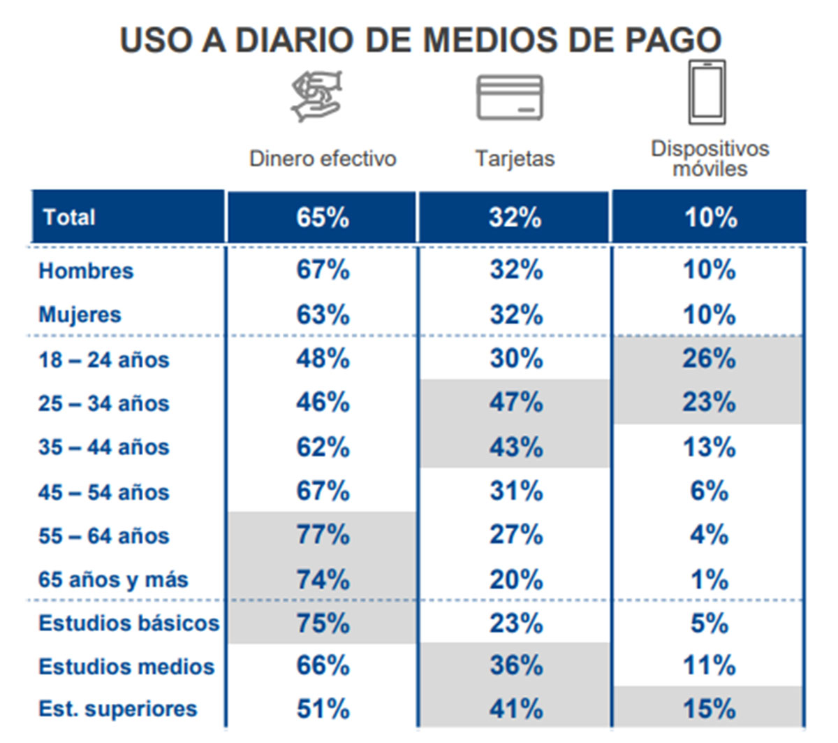 Por otro lado, en cuanto a la formación y nivel de estudios, las personas con estudios básicos son las que más usan el efectivo a diario, mientras que las tarjetas son más utilizadas por personas con estudios medios y superiores, y los dispositivos móviles por las que tienen estudios superiores. Las cifras lo avalan, dado que el 15 % de las personas con estudio superiores opta por pagar con el móvil.