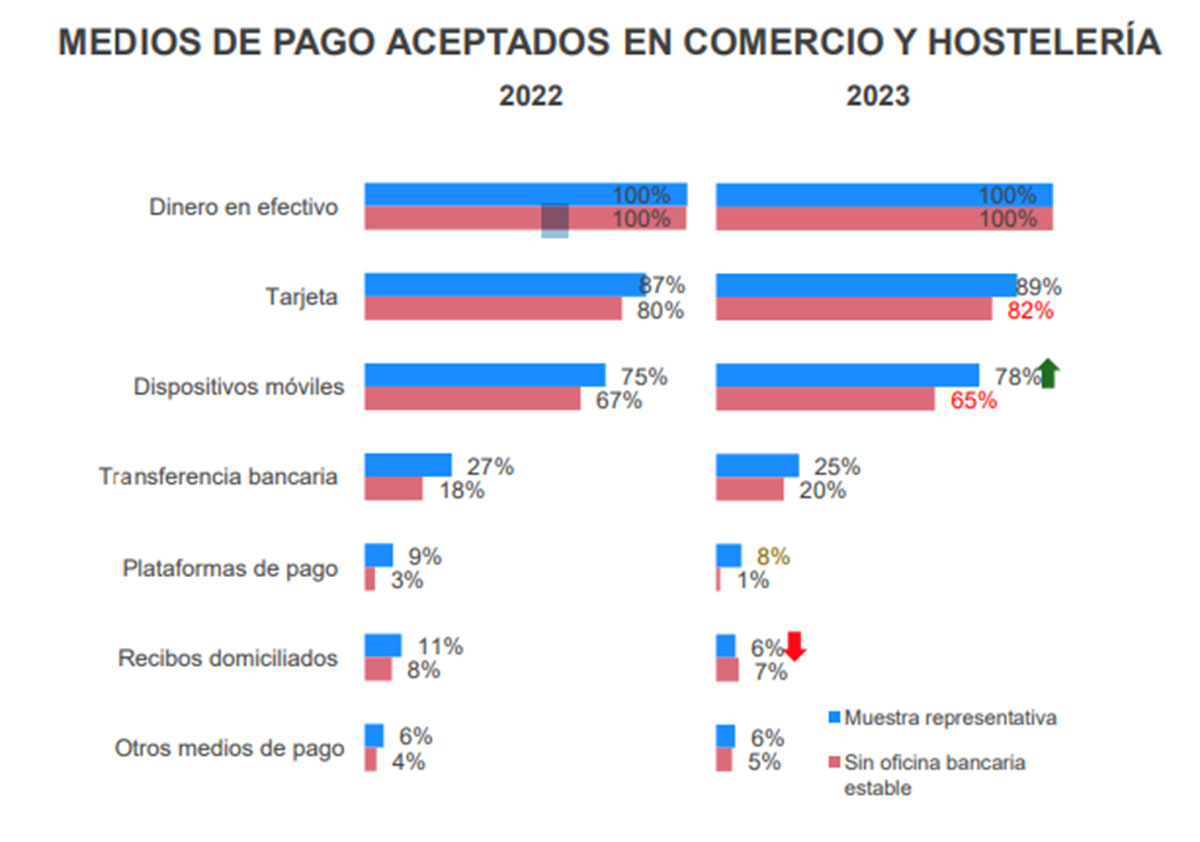 De manera general, el efectivo sigue aceptándose en la práctica totalidad del pequeño comercio y hostelería, mientras que la tarjeta y dispositivos móviles son aceptados en el 89 y 78 % de ellos, respectivamente. Y, en especial, los medios de pago electrónicos se admiten en menor proporción en municipios sin oficina bancaria estable.