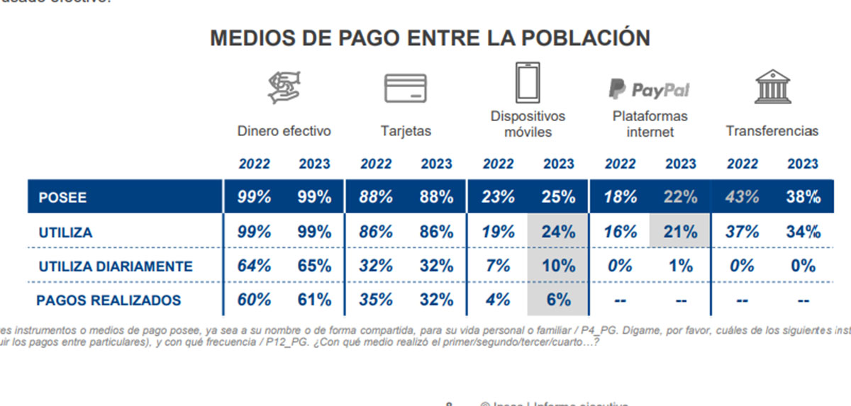 Respecto a las otras fórmulas, el 61 % de los encuestados realiza pagos con dinero en metálico y asciende hasta el 99 % la cantidad de personas que usa y posee este método para pagar. Ambas cifras crecen un punto frente a 2022. En cuanto a las tarjetas, el 32 % las usa a diario, al igual que en 2022. Pero baja en tres puntos la cantidad de personas que pagan con este método de forma general. A nivel general, el 88 % posee este método de pago y el 86 % lo usa.