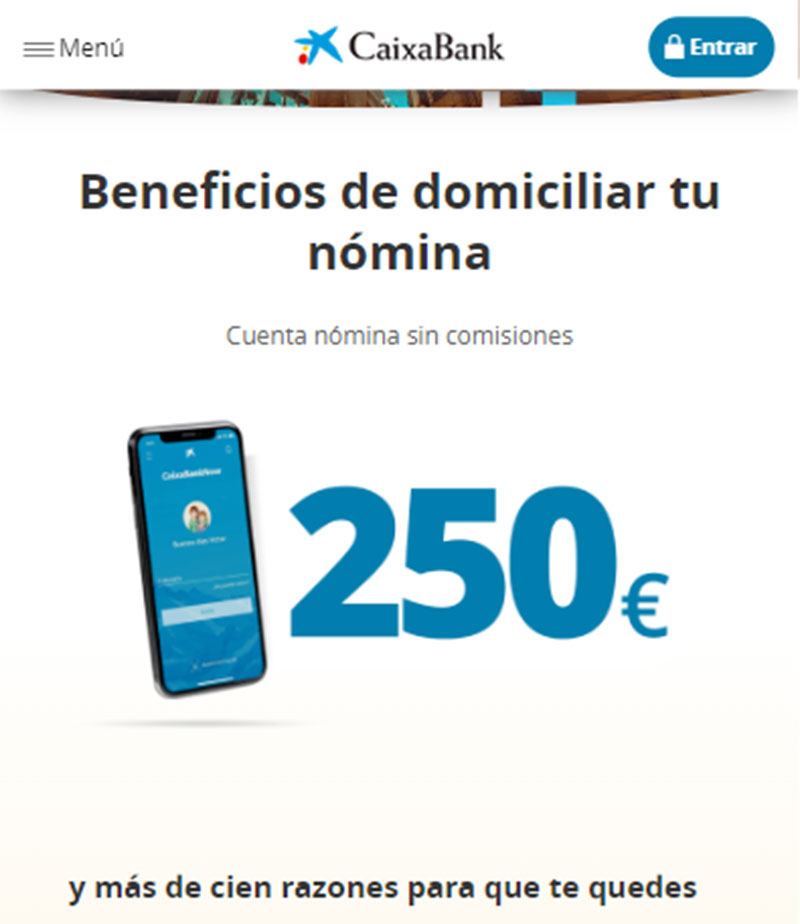 CaixaBank regala hasta 250 euros a los clientes que domicilien una nómina de, al menos, 1.500 euros. La entidad ofrece este incentivo a los nuevos usuarios que abran la cuenta nómina sin comisiones de este banco y se ajusten a las condiciones de esta promoción.