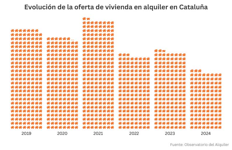 La reducción de la oferta este último año ha sido de 39.785 viviendas, lo que supone una caída del 25,7 %, uno de los datos más acusados del país que solo comparten otras comunidades autónomas, como el País Vasco o Asturias, donde la amenaza de declarar zonas tensionadas también ha ahuyentado a los propietarios del mercado.