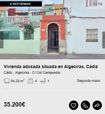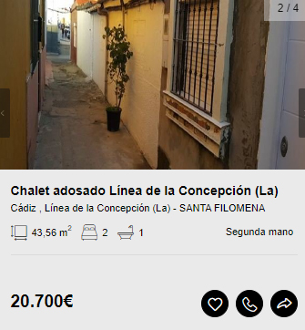En el municipio costero de La Línea de la Concepción, en Cádiz, se vende este otro adosado por un precio de 20.700 euros a solo 600 metros de la playa. Esta vivienda unifamiliar tiene una superficie de 43,56 m², distribuido en una sola planta que incluye dos habitaciones, un baño, cocina y salón-comedor.