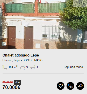 En Lepe (Huelva), se vende este adosado por 70.000 euros. El chalet cuenta con una sola planta, 104 m² construidos, tres habitaciones, un baño, cocina amueblada y salón-comedor.