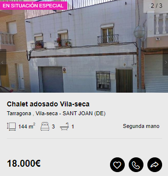 En Vila-Seca (Tarragona), está en venta este chalet adosado por 18.000 euros. El inmueble cuenta con 144 metros cuadrados de superficie construida y están distribuidos en tres dormitorios, un baño, cocina amueblada, salón-comedor y dos plantas.