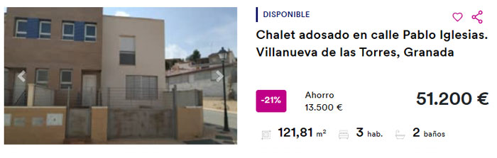 Por 51.200 euros se vende este otro chalet adosado en Villanueva de las Torres (Granada). Se trata de una vivienda unifamiliar con 121,81 m² de superficie total construida, repartidos en dos plantas. Se distribuye en planta sótano con garaje y un trastero; planta baja, con salón, cocina, un aseo y el patio; y en la planta alta tres dormitorios.