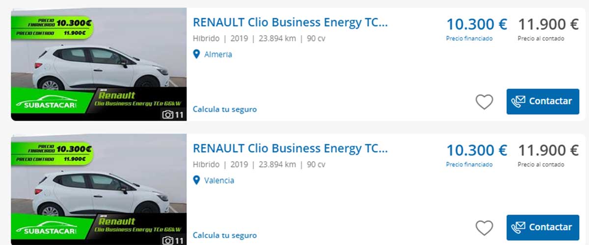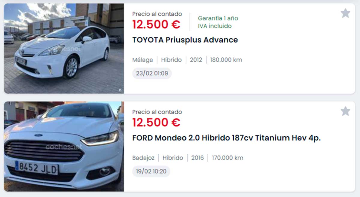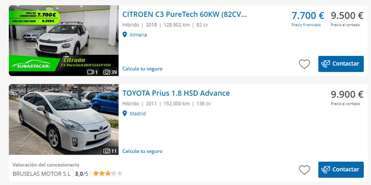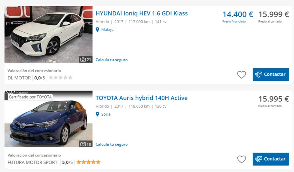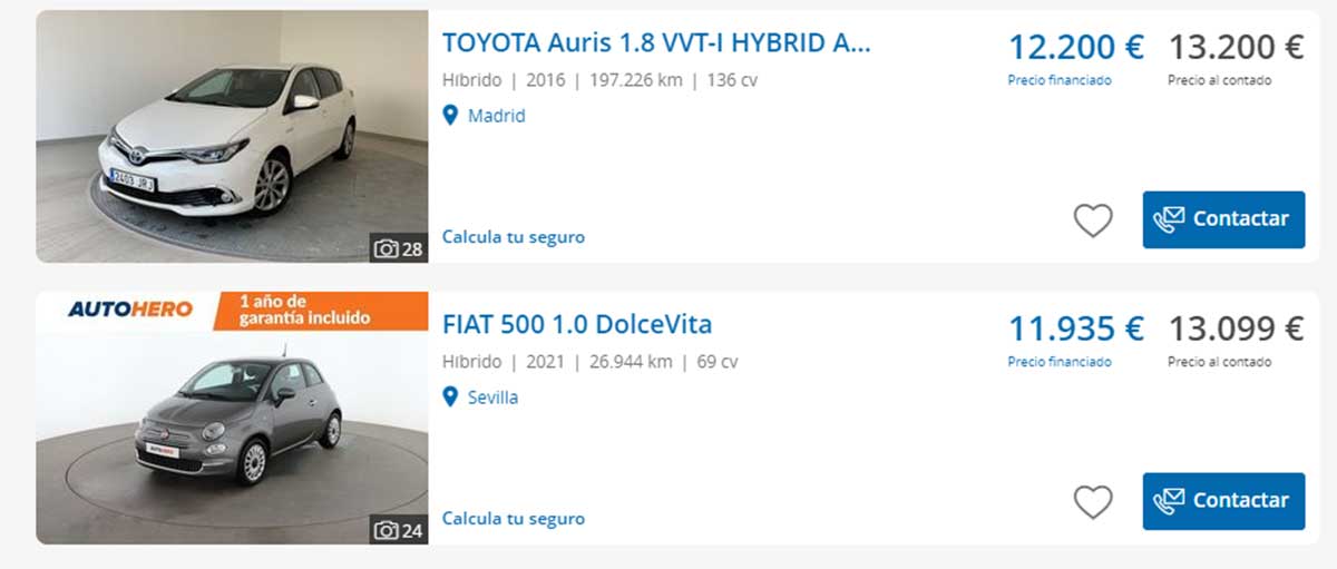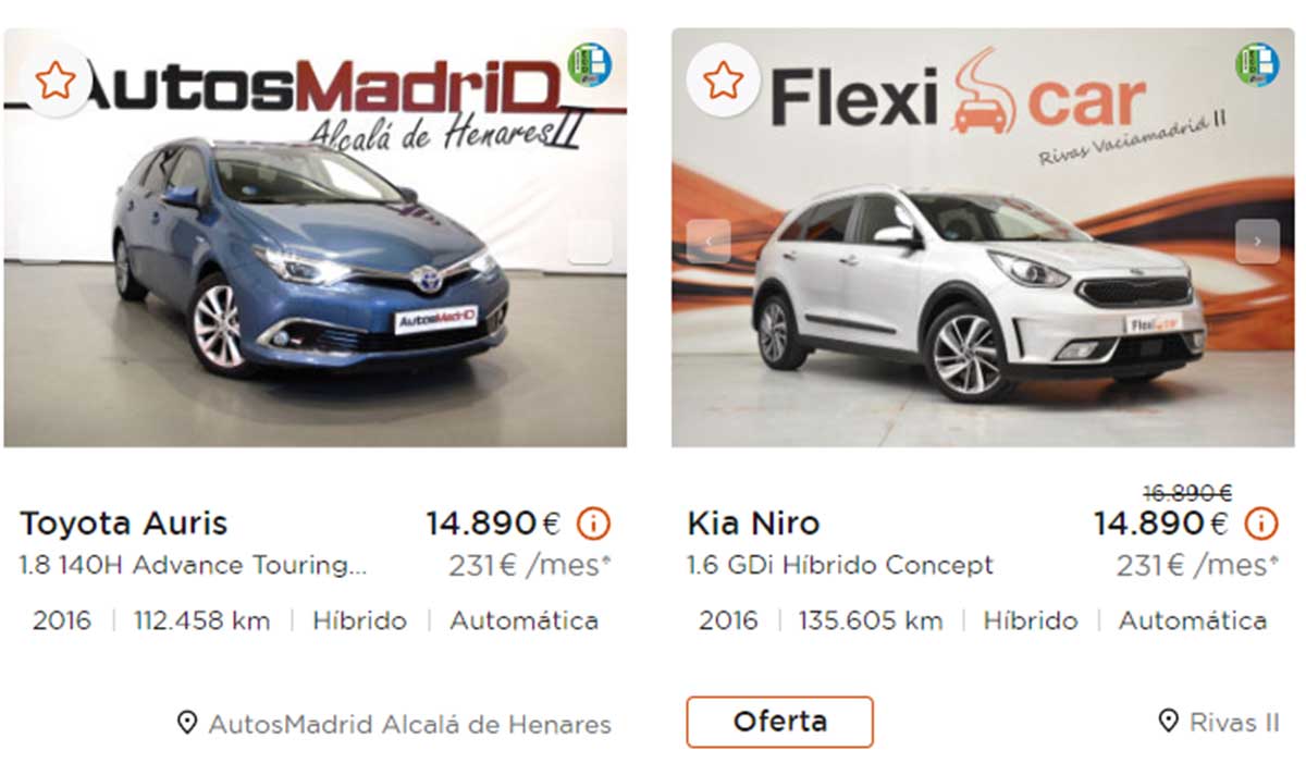 Otra plataforma en la que es posible comprar un coche de ocasión de tipo híbrido a un bajo precio es Autocasión. Del catálogo disponible en el portal, puedes ver a continuación algunos ejemplos de coches híbridos por menos de 16.000 euros a la venta: