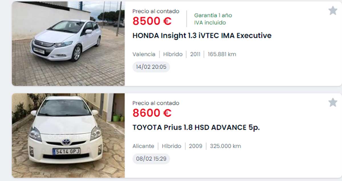- Honda Insight 1.3 iVTEC IMA Executive por 8.500 euros. Es un coche del año 2011 con 165.881 kilómetros de tipo híbrido con una garantía de un año incluido.