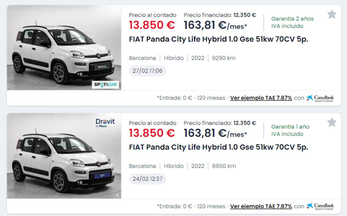 - Fiat Panda híbrido a la venta por 13.850 euros. Es el modelo Panda City Life Hybird 1.0 Gse de 51 kilovatios. Es del año 2022 y tiene 9.290 kilómetros.