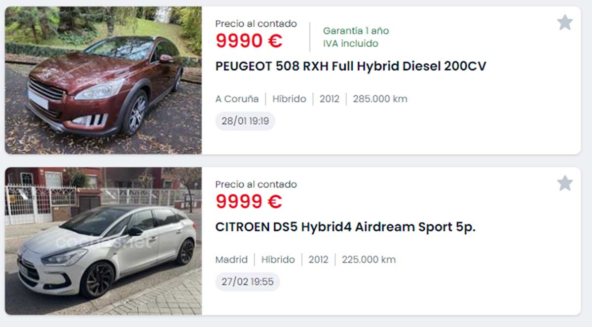 - Peugeot 508 híbrido diesel de 200 CV y un precio de 9.990. Es del año 2012 y tiene un total de 285.000 kilómetros.