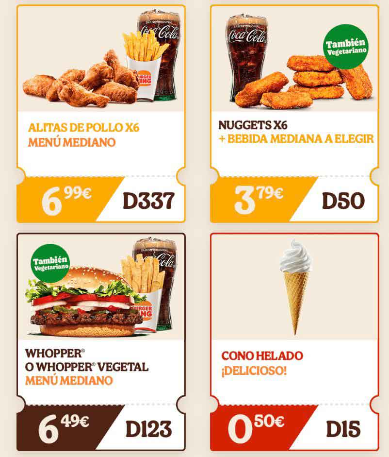 - D123 – Menú mediano Whopper o Whopper vegetal por 6,49 euros.