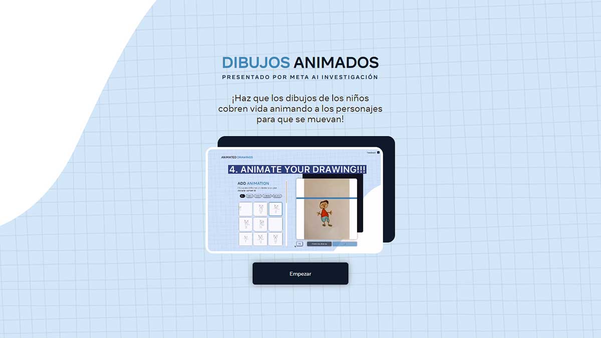 El procedimiento a seguir para animar un dibujo en papel es muy fácil. Solamente hay que utilizar Animated Drawing, una web resultado de un proyecto de Inteligencia Artificial de Meta, que permite transformar cualquier dibujo realizado en papel en un muñeco lleno de vida que se mueve, corre, salta, saluda y hasta practica boxeo. Una vez dentro de Animated Drawings, hay que pulsar en el botón que se encuentra en el centro de la pantalla y que dice ‘Empezar’.
