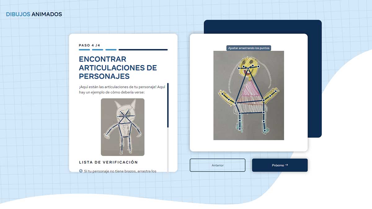 Por último, antes de que el personaje cobre vida, hay que señalar cada uno de los puntos de las articulaciones del dibujo. Es decir, señalar las muñecas, codos, hombros, pies, rodillas, cadera, nariz, orejas, ojos y todas las zonas clave que quieras que se muevan del personaje. Una vez completados los pasos anteriores, ¡a disfrutar! El muñeco ha cobrado vida propia y ya puedes verlo cómo corretea por la pantalla.
