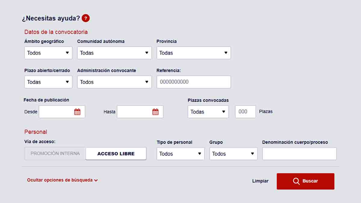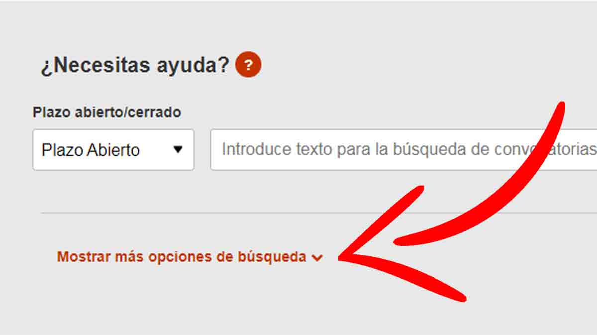 Si, por el contrario, estás buscando unas oposiciones muy concretas, el buscador te permite seleccionar una serie de filtros añadidos para que tu búsqueda sea más específica. Para hacer una búsqueda de este tipo tienes que seleccionar la pestaña que aparece en naranja en el interior del buscador que dice ‘Mostrar más opciones de búsqueda‘ tal y como aparece en la imagen.