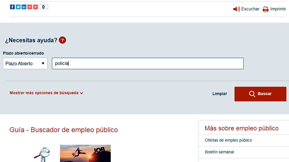La búsqueda más genérica pasa por seleccionar si estás buscando una convocatoria con plazo abierto o cerrado (o de los dos tipos) así como introducir las palabras clave de la convocatoria que quieras buscar, por ejemplo escribir la palabra policía si estás buscando las diferentes candidaturas este tipo de trabajo.