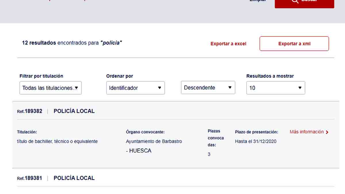 Otra de las posibilidades que ofrece el buscador es solicitar a la página exportar los datos en formato excel o en XML para tener guardadas las candidaturas en un documento en tu propio ordenador.