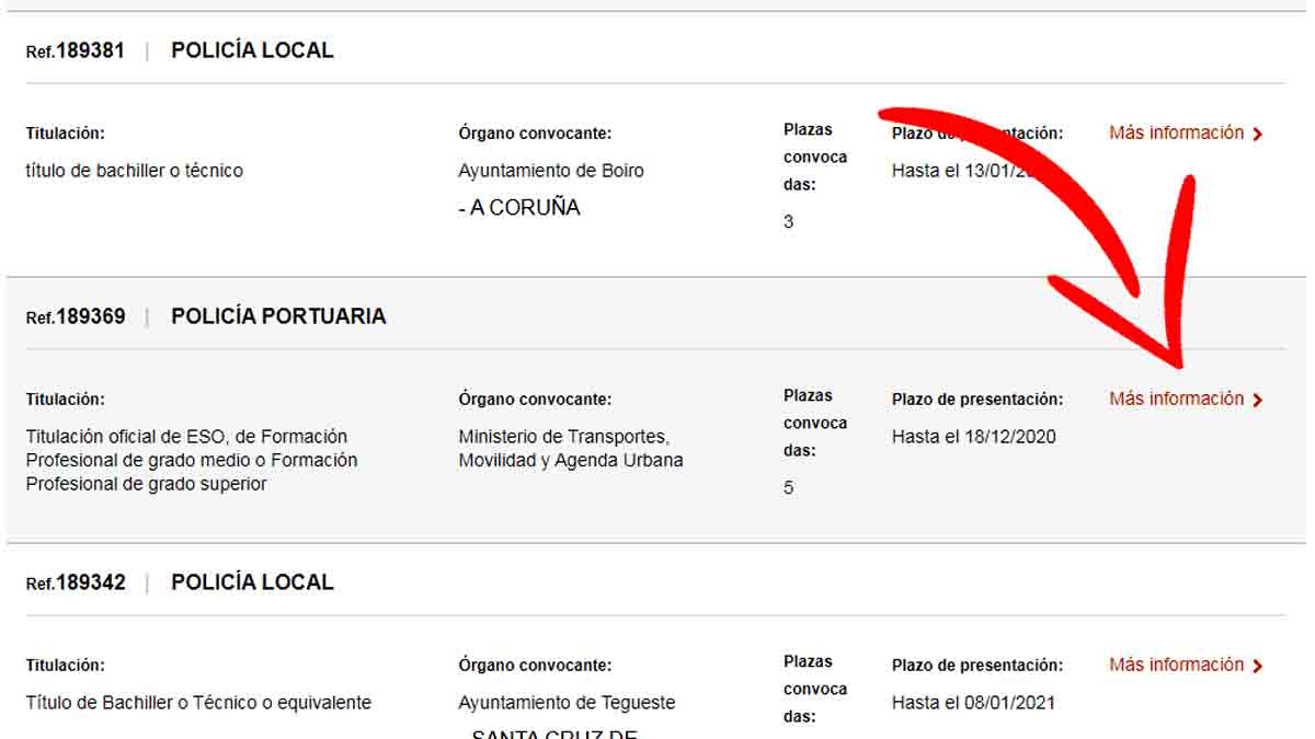 Si pinchamos en la pestaña ‘Más información‘ que aparece en la parte derecha de cada convocatoria, se abre una nueva página en la que se describe con mucho más detalle todo lo que hay que saber de cada una de las oposiciones.
