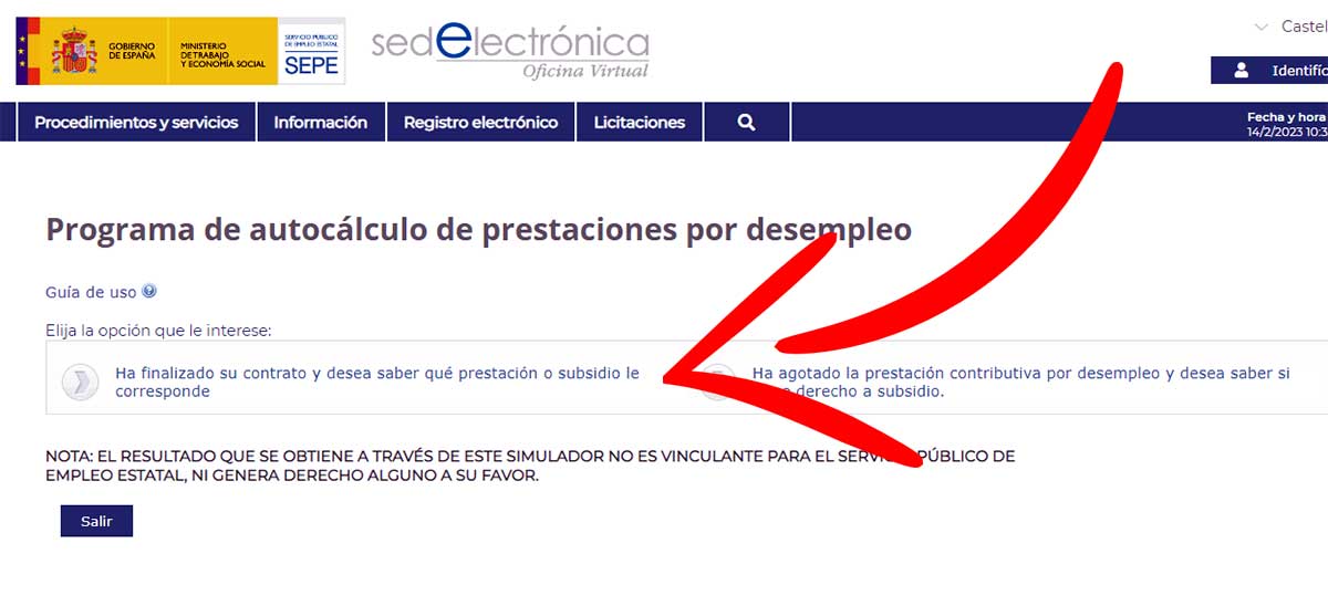 Lo primero que hay que hacer es acceder a la web de la herramienta específica del SEPE. En la pantalla principal, tal y como aparece en la siguiente imagen, hay que pulsar el botón que aparece en la parte izquierda de la pantalla que dice ‘Ha finalizado su contrato y desea saber qué prestación o subsidio le corresponde’.