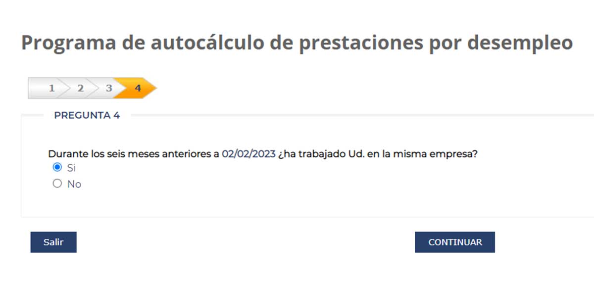 La siguiente pregunta que plantea la herramienta es si durante los seis meses anteriores a la fecha de finalización del contrato de trabajo has mantenido el puesto en la misma empresa. En este caso, seleccionamos la pestaña ‘Sí’.