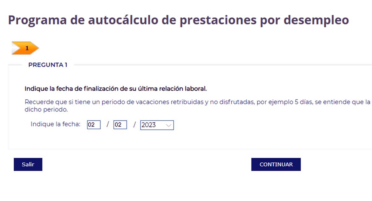 A continuación lo siguiente que aparece en pantalla es una pregunta sobre la fecha de finalización de la última relación laboral. Pero ojo, porque hay que tener en cuenta algunos aspectos antes de indicar la fecha de finalización. En concreto, en la web aparece explicado que hay que tener en cuenta que si tienes algún periodo de vacaciones retribuidas y no disfrutadas, se entiende quela relación termina cuando transcurra este periodo y no antes. Una vez aclarado este punto, hay que indicar la fecha. Vamos a realizar un ejemplo indicando que el contrato ha finalizado a fecha del 2 de febrero de 2023.