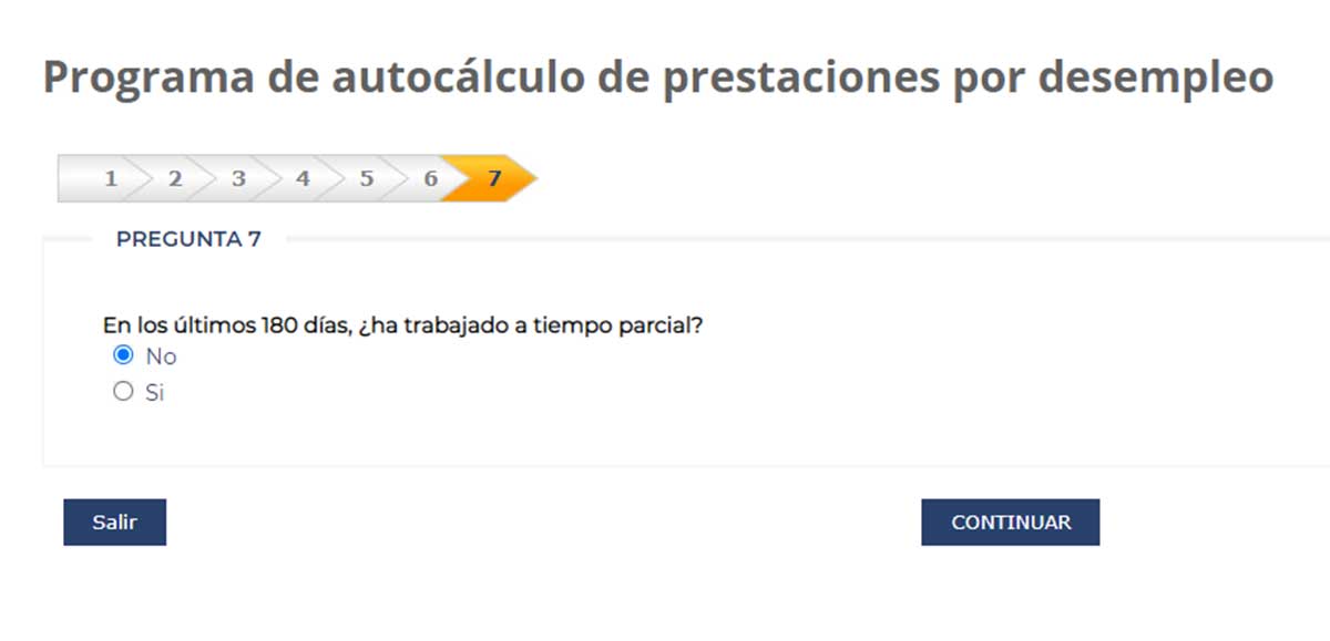 La séptima pregunta hace referencia a si en el periodo comprendido durante los últimos 180 días el trabajador ha realizado una jornada a tiempo parcial. En este caso, seleccionamos que ‘No’.