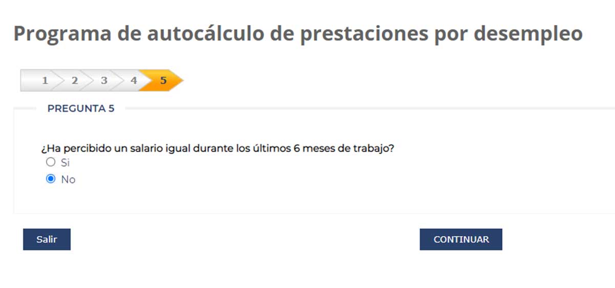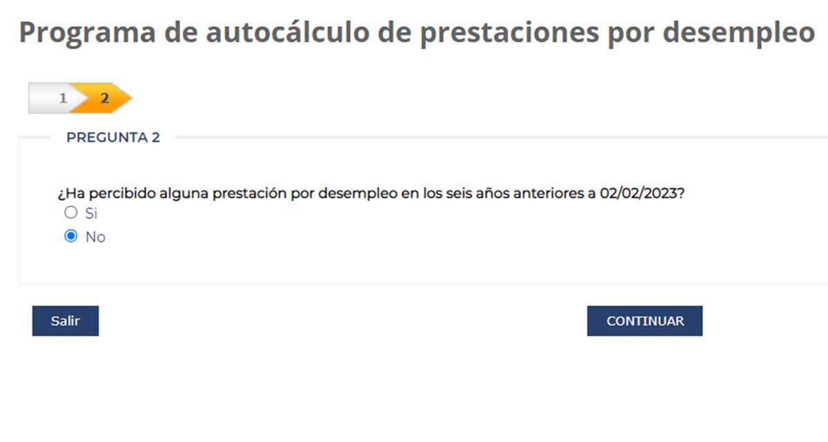 Al pulsar en el botón continuar, aparece otra pregunta en la que se indica si has recibido alguna prestación por desempleo en los seis años anteriores a la fecha indicada. En este caso, seleccionamos la opción que dice ‘No’.