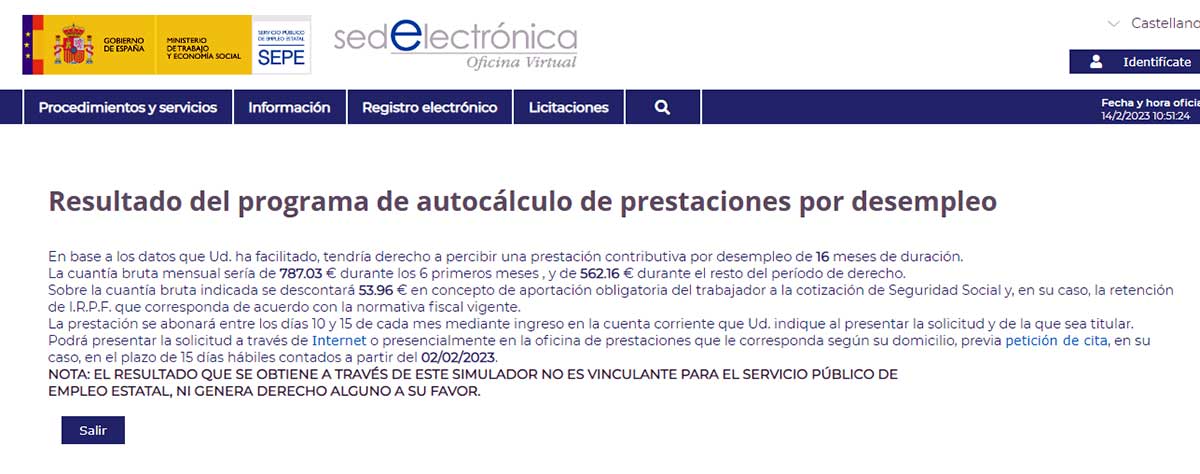 Al hacerlo, aparece en pantalla una imagen como la que puedes ver a continuación que dice ‘Resultado del programa de autocáclulo de prestaciones por desempleo’.