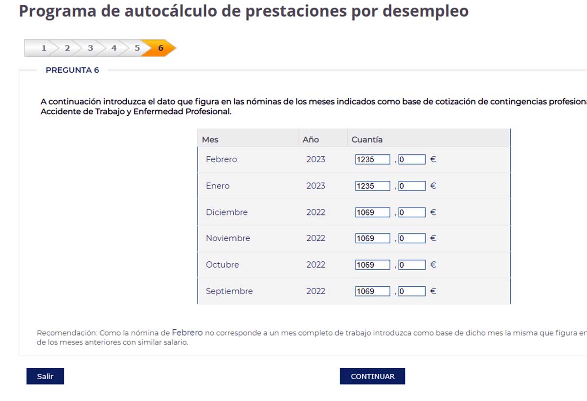 A continuación hay que indicar el sueldo de las nóminas de los últimos seis meses de trabajo, tal y como aparece en la siguiente imagen:
