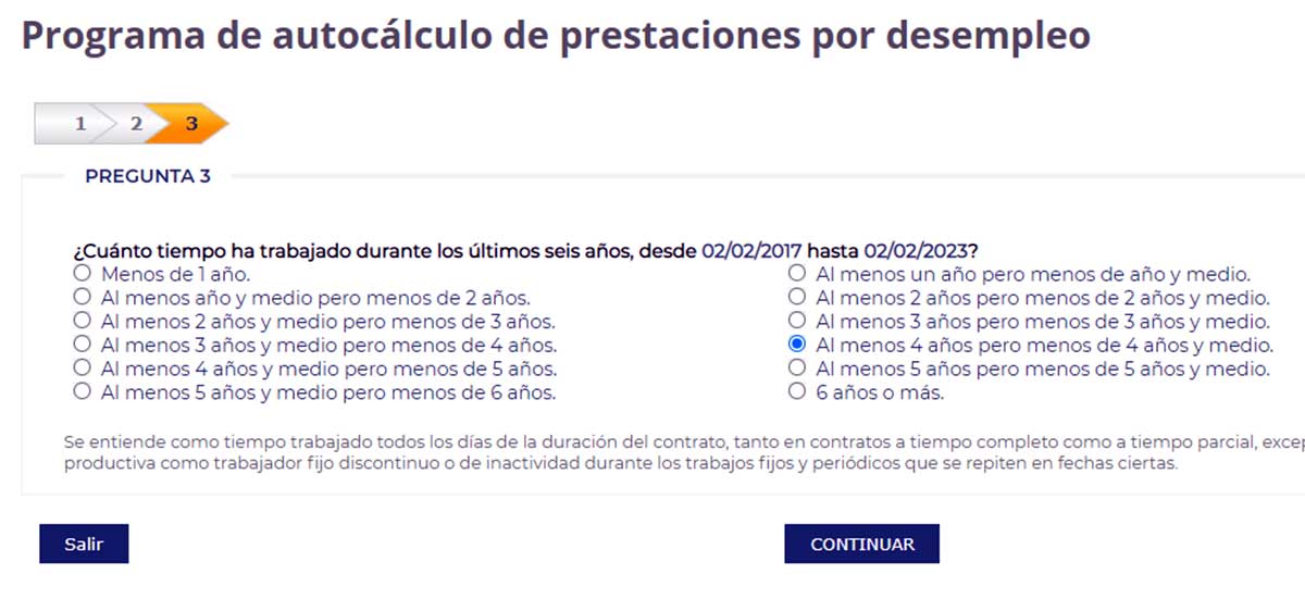 La pregunta tres pide al solicitante que señale durante cuánto tiempo ha trabajado en los últimos seis años. Y establece un desplegable con distintas opciones. En concreto, para este ejemplo, vamos a seleccionar la pestaña de ‘Al menos 4 años, pero menos de 4 años y medio’.