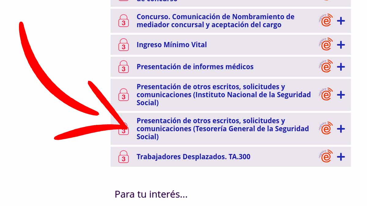 Al hacerlo se abre una nueva pantalla en la que tienes que desplazarte hasta el final y buscar la pestaña que dice ‘Presentación de otros escritos, solicitudes y comunicaciones (Tesorería General de la Seguridad Social)’.