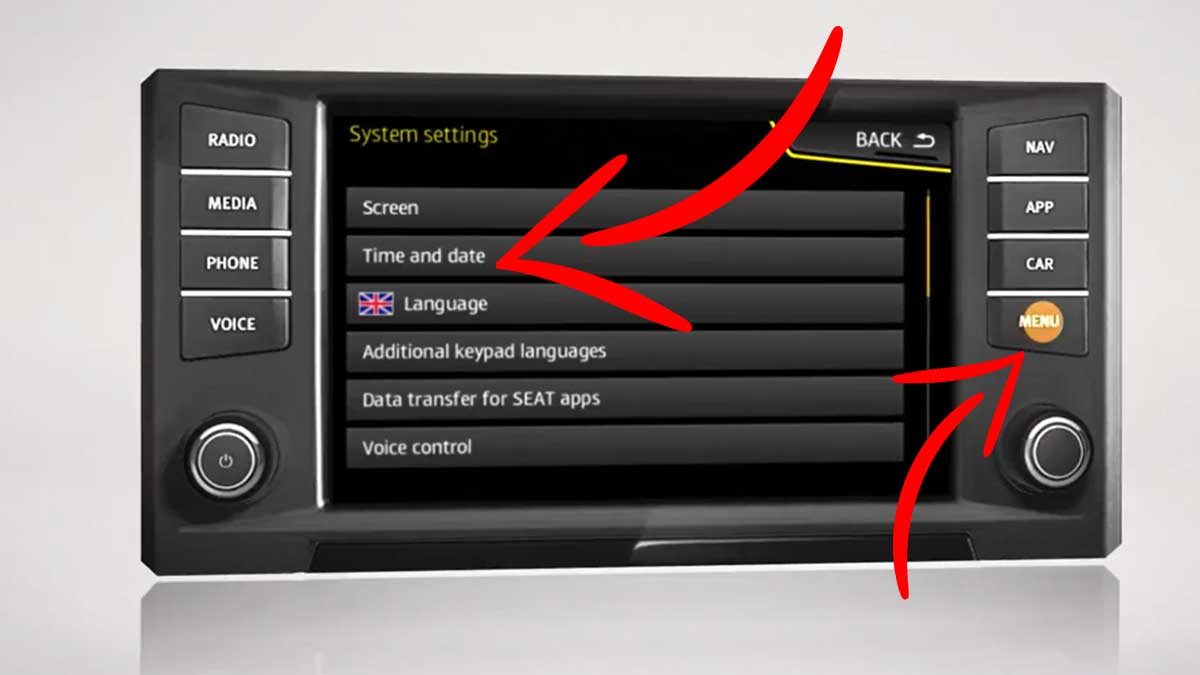 En los coches más nuevos que tienen incorporada una pantalla táctil, el proceso de cambio de hora es bastante intuitivo. En estos casos, tienes que buscar en la pantalla la forma de acceder a los ‘Ajustes de hora y fecha’ o ‘Settings’ si tienes el menú en inglés. Algunos coches, como en el caso de algunos modelos del Seat Ateca, tendrás que hacerlo desde un botón lateral de la pantalla que se llama ‘Menú’ y que da acceso al menú principal, como puedes ver en la imagen.