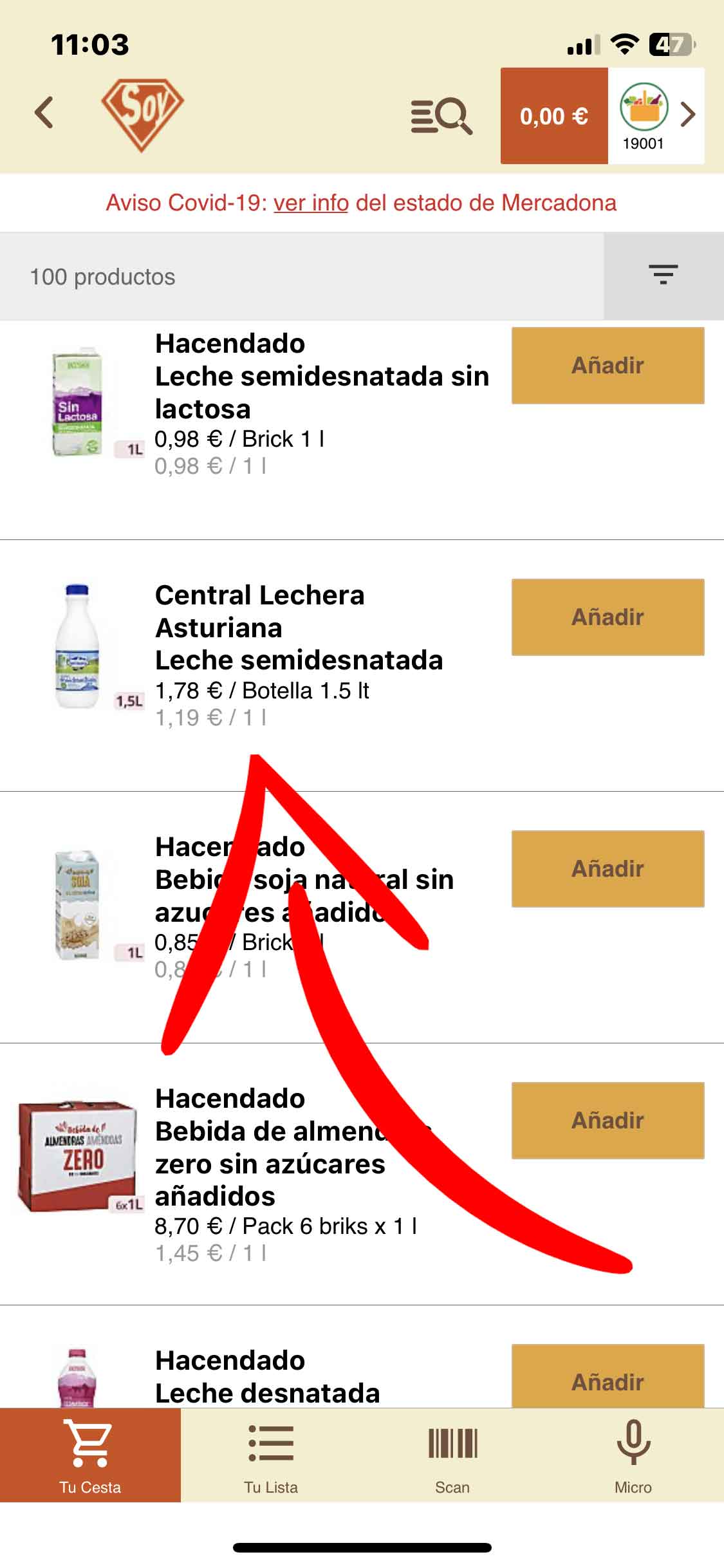 Una vez dentro, localizar el producto específico que quieres comparar, en este caso una botella de leche Asturiana de 1,5 litros semidesnatada y pulsar sobre ese producto. Al hacerlo, se abre una nueva pantalla en la que aparece el precio de lo que cuesta ese producto en cada uno de los supermercados.