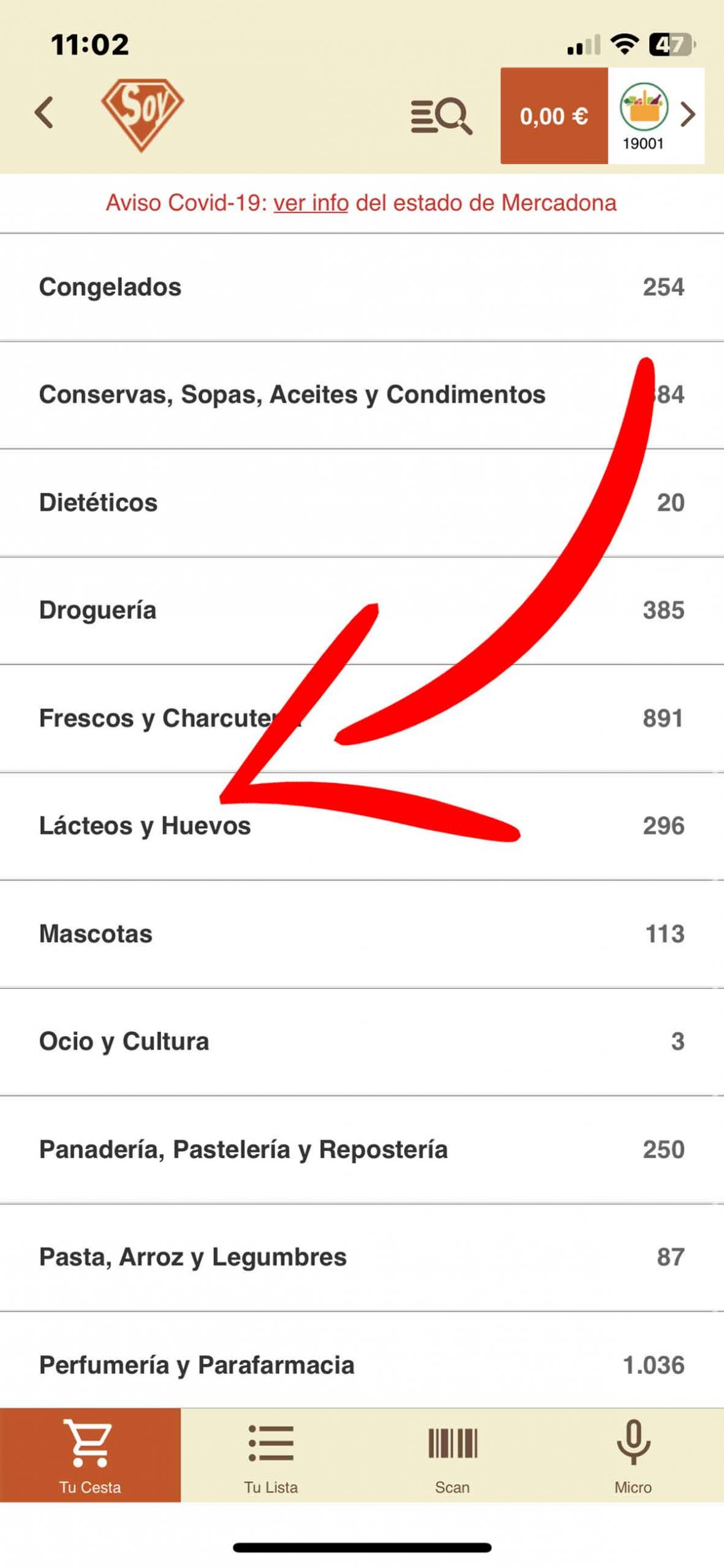 Por ejemplo, vamos a comparar el precio de lo que cuesta una botella de leche de un litro y medio de la marca Central Lechera Asturiana. Para ello, hay que seleccionar la pestaña ‘Buscar por categoría’ y, en el interior, acceder a la sección ‘lácteos y huevos’ y, después, al apartado de ‘Leche’.