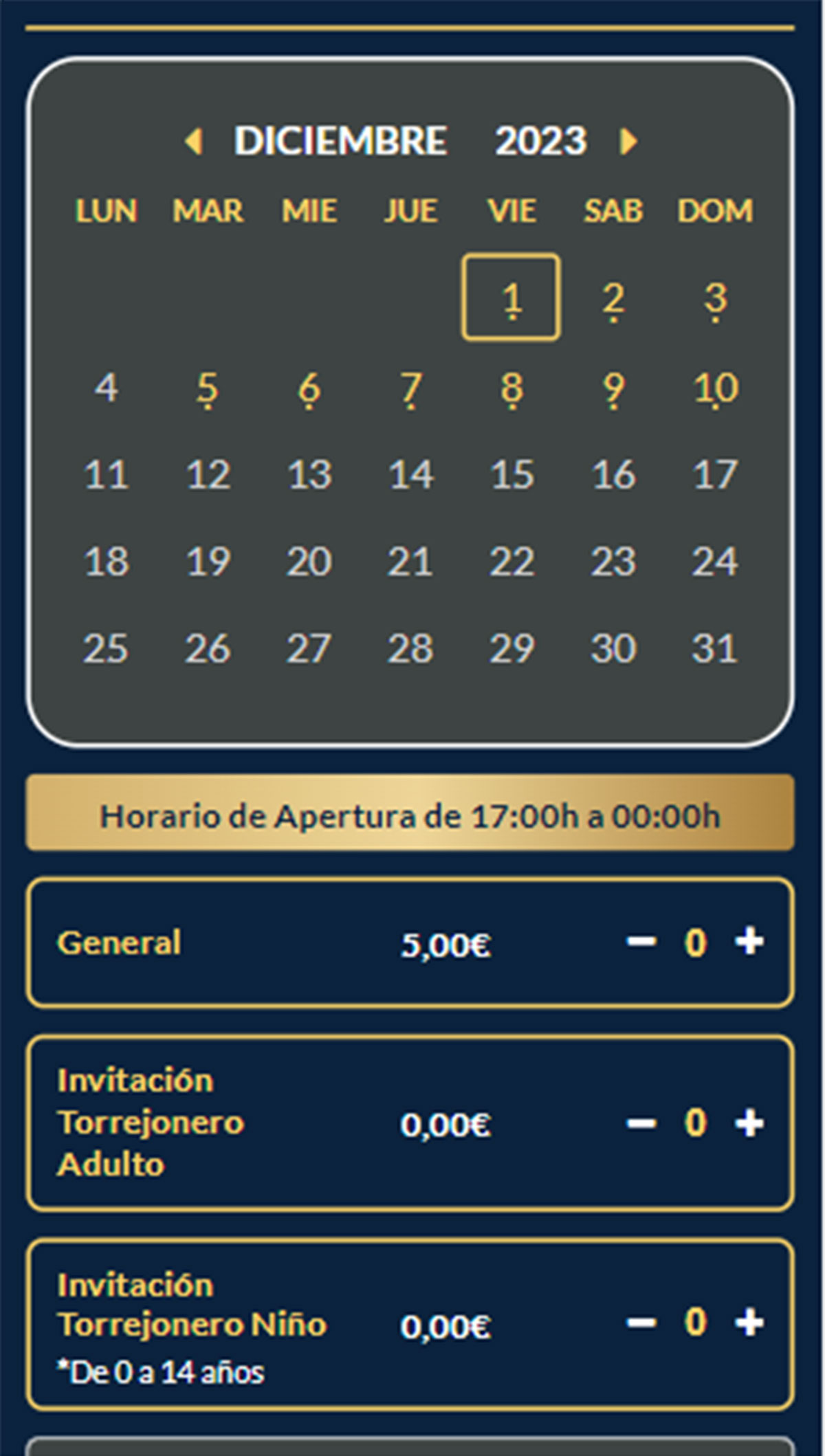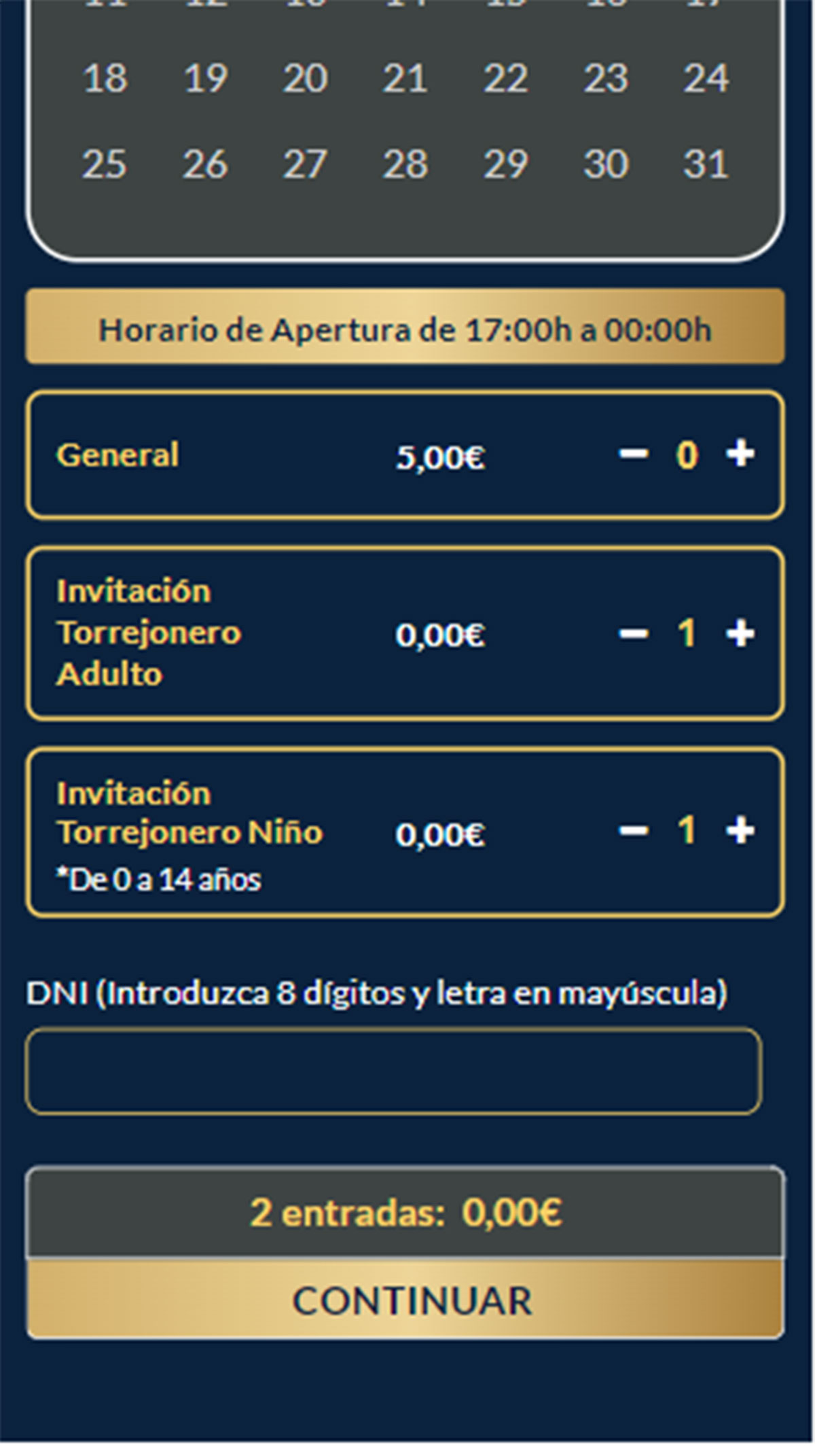En el caso de estar empadronado en Torrejón, en el proceso de compra de entradas hay que seleccionar la opción ‘Invitación empadronados’. Al hacerlo, aparece en pantalla un mensaje informativo sobre los días y condiciones a las que permite el acceso este tipo de entrada.
