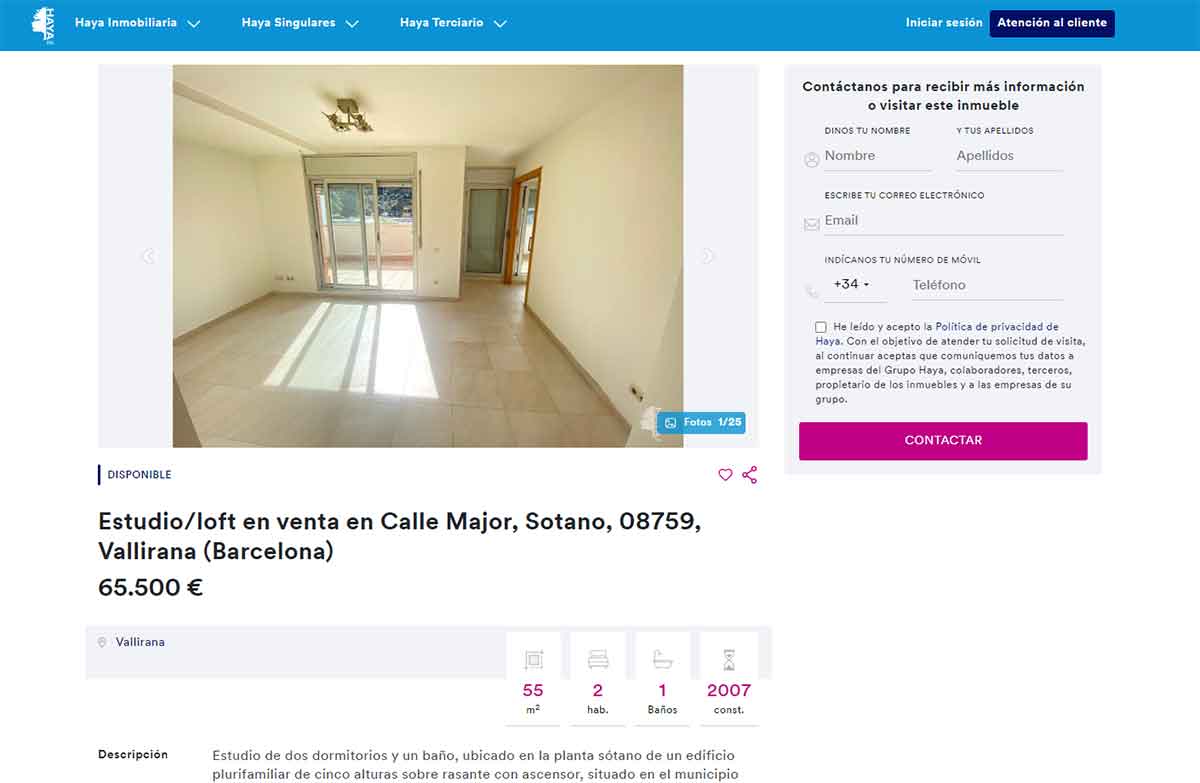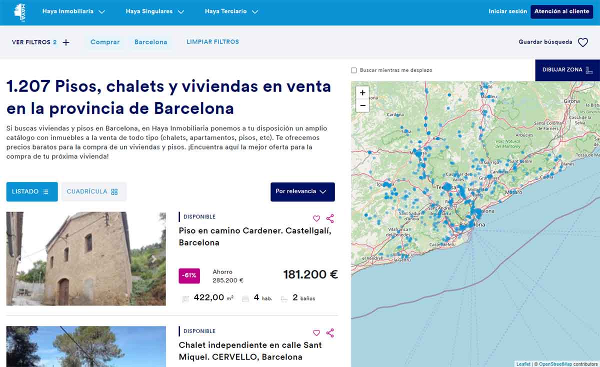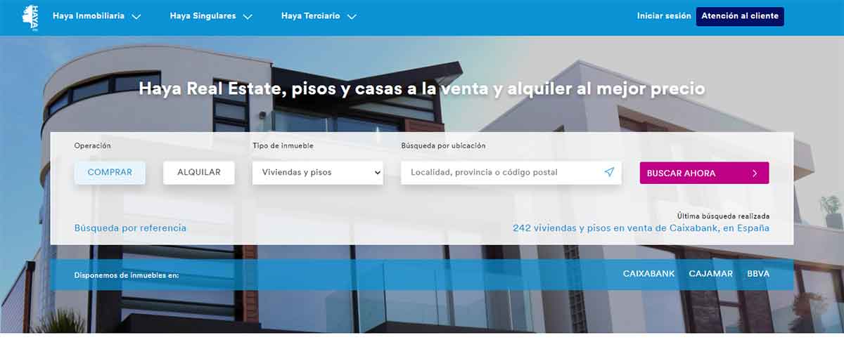 El portal Haya Inmobiliaria es una entidad que cuenta con un amplísimo catálogo de pisos, casas, chalés, garajes, locales y otros inmuebles en venta propiedad de diferentes entidades. De CaixaBank, de BBVA, de Cajamar y hasta de inversores privados.