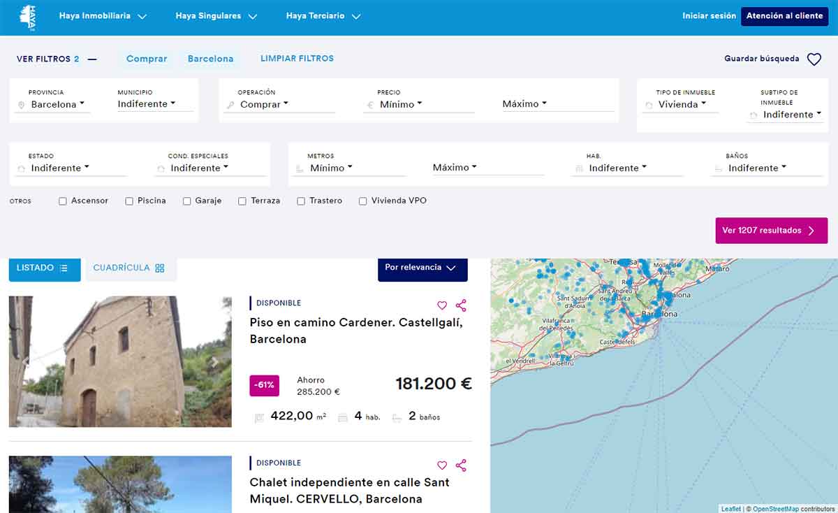 De manera adicional, justo debajo del buscador hay tres pestañas, ubicadas en la parte derecha de la pantalla, que son tres botones que llevan directamente al catálogo completo que tiene disponible la entidad de cada uno de los bancos con los que trabaja. Es decir, que en el caso de que quieras ver las viviendas disponibles en Haya de CaixaBank, puedes acceder directamente desde el botón que aparece debajo del buscador.