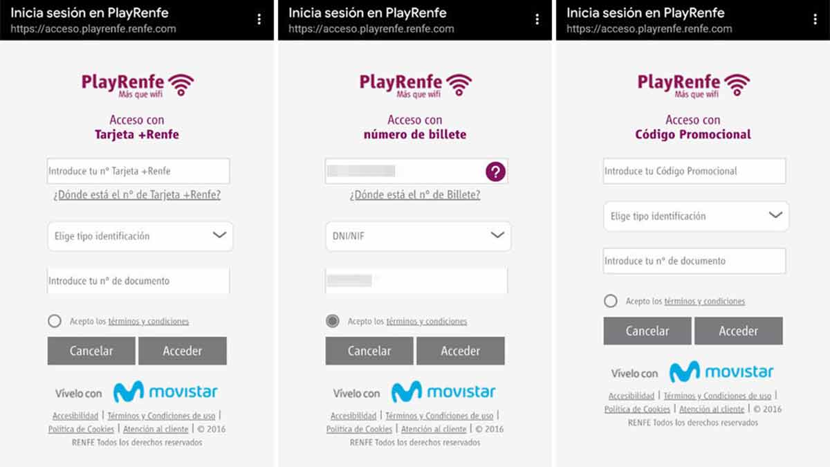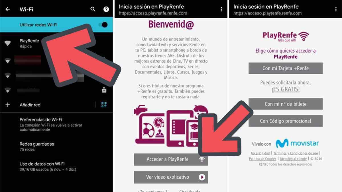 Una vez el teléfono te muestre la red wifi ‘PlayRenfe’, pulsa sobre esta pestaña. De forma automática el teléfono abrirá una nueva pestaña en el navegador en la que tendrás que seleccionar la pestaña ‘Acceder a PlayRenfe’, que encontrarás al final de la página. Puedes ver los pasos del proceso en la siguiente imagen:
