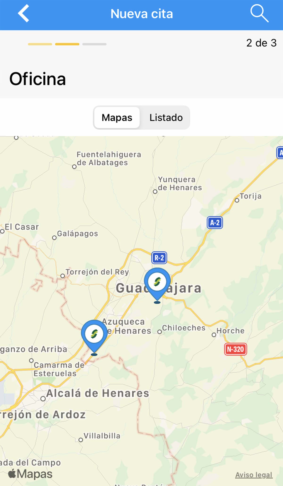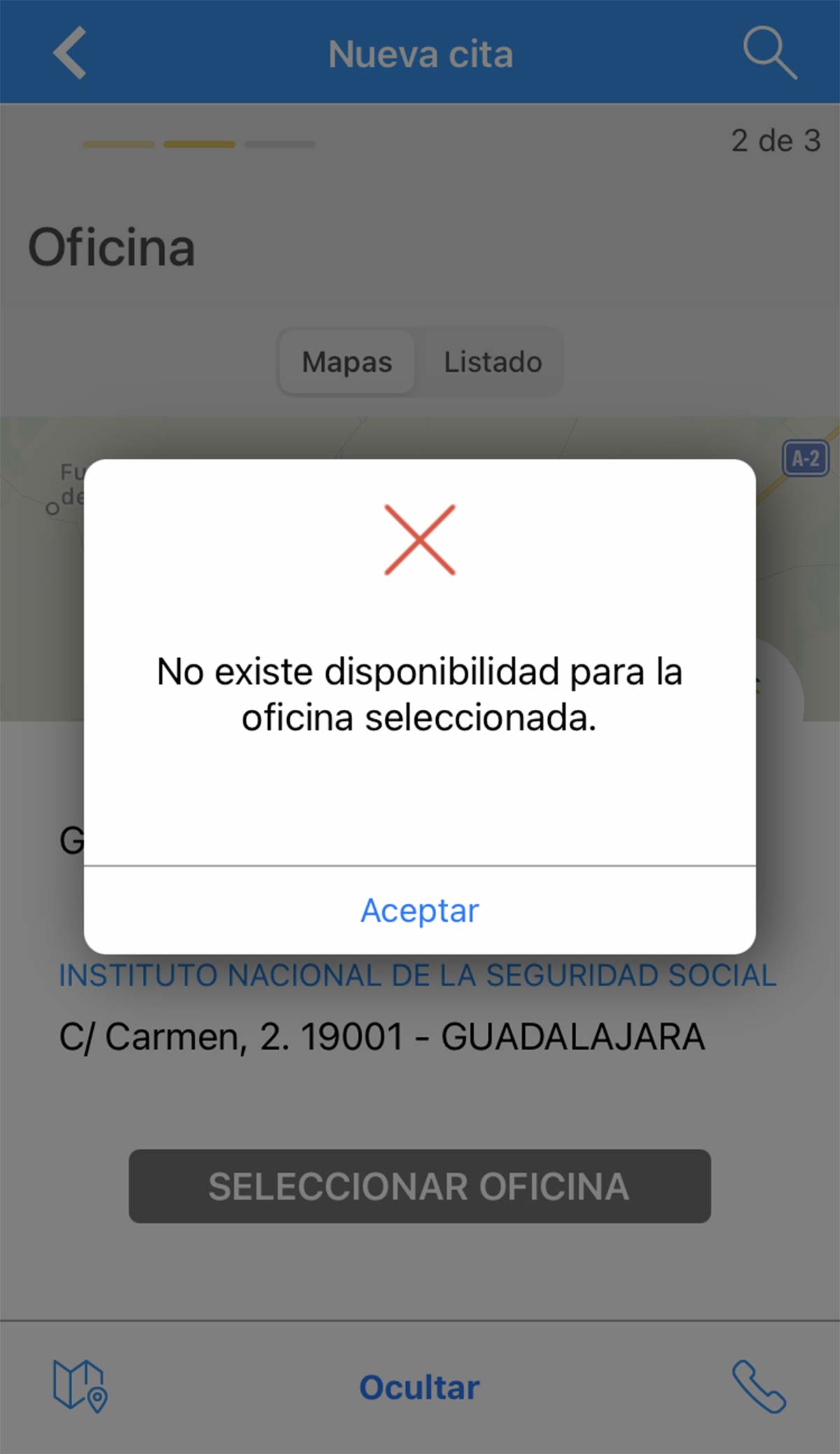 En el mapa van a aparecerte las oficinas más cercanas en las que puedes pedir una cita. Selecciona la que prefieras. Al hacerlo, la app va a indicarte si hay huecos disponibles para pedir una cita previa o no. Si la aplicación no te deja continuar porque quieres pedir una cita y en las oficinas no hay disponibilidad, puedes intentar pedir cita a la Seguridad Social por otras vías, como por ejemplo solicitar cita a las oficinas de la Seguridad Social por teléfono.