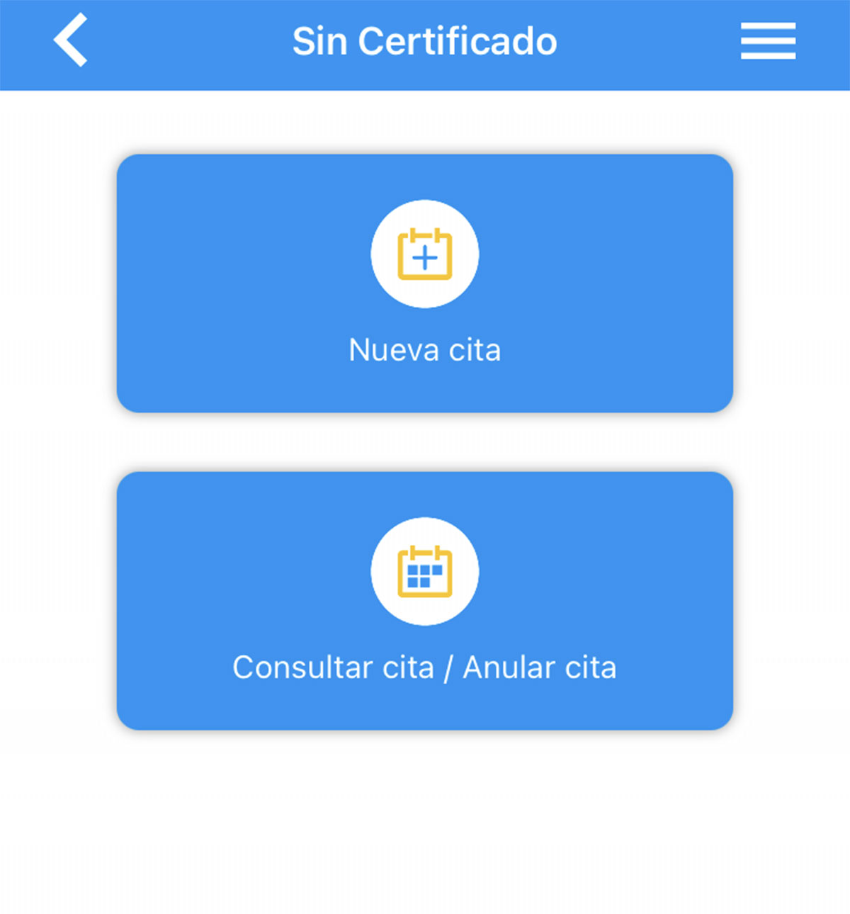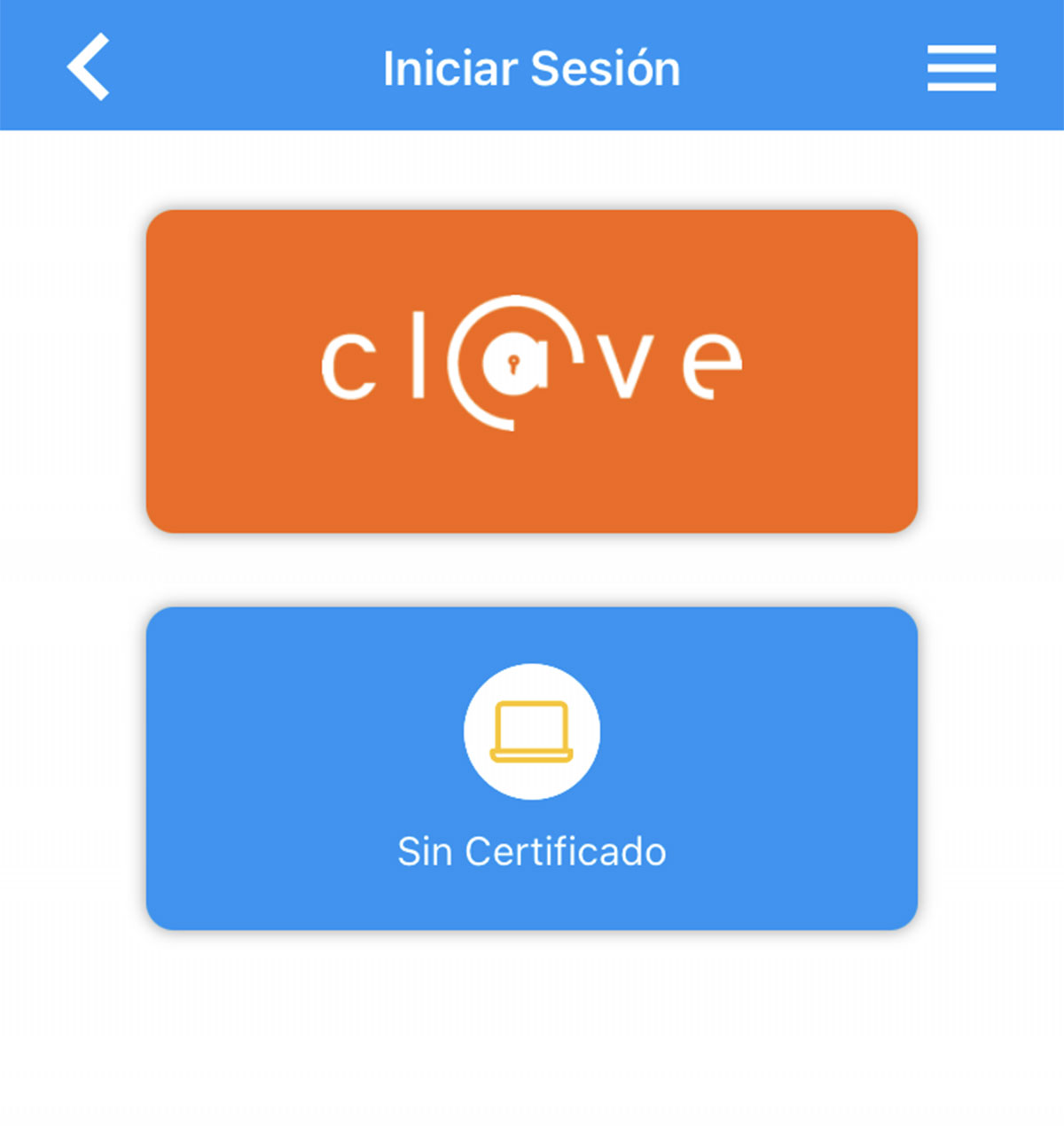El siguiente paso es seleccionar si quieres acceder con Cl@ve o sin certificado (firma digital). Para este ejemplo vamos a explicar el procedimiento sin certificado digital. En el caso de querer hacerlo con cl@ve, la app va a pedirte que te identifiques y, a continuación, a fijar la fecha y lugar de la cita previa. Para solicitar la cita, si no tienes ningún tipo de firma digital, hay que pulsar en el botón azul que dice ‘Sin certificado’.