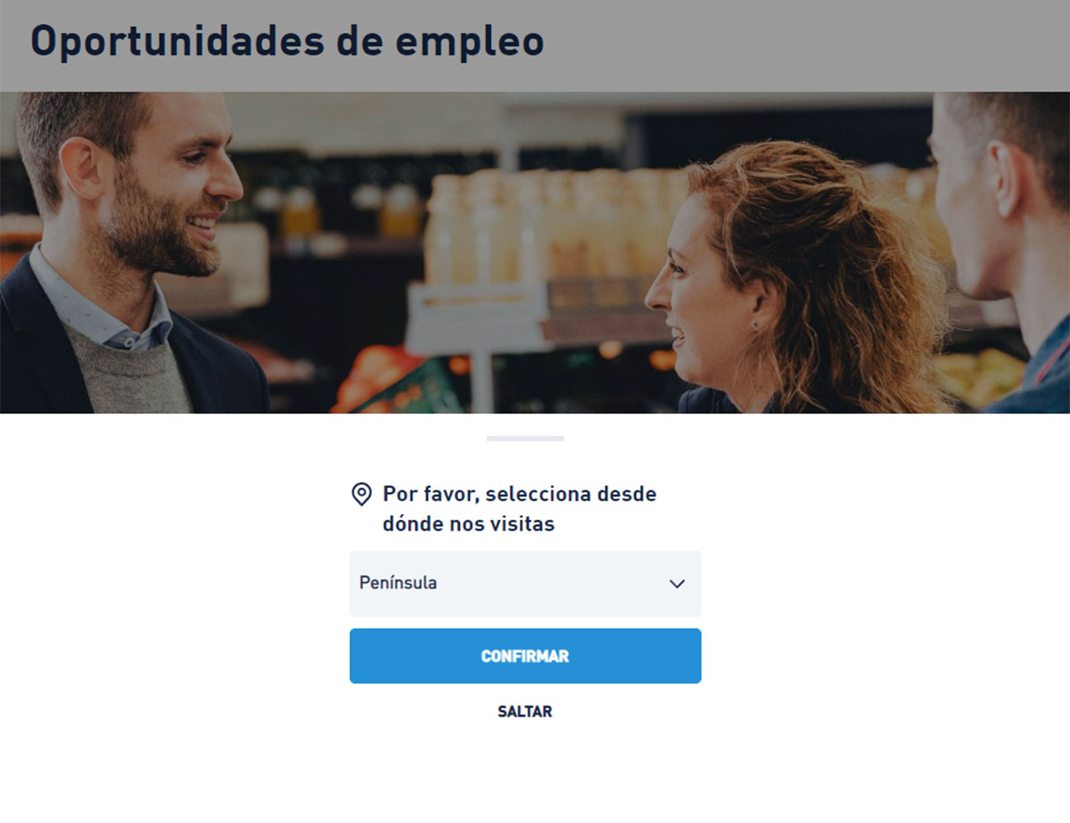 En la pantalla principal lo primero que aparece es una ventana emergente en la que hay que indicar la zona de residencia, si es en la península o en las islas. El objetivo es filtrar la búsqueda para que aparezcan los puestos de trabajo que se encuentren más cerca del domicilio de cada solicitante.