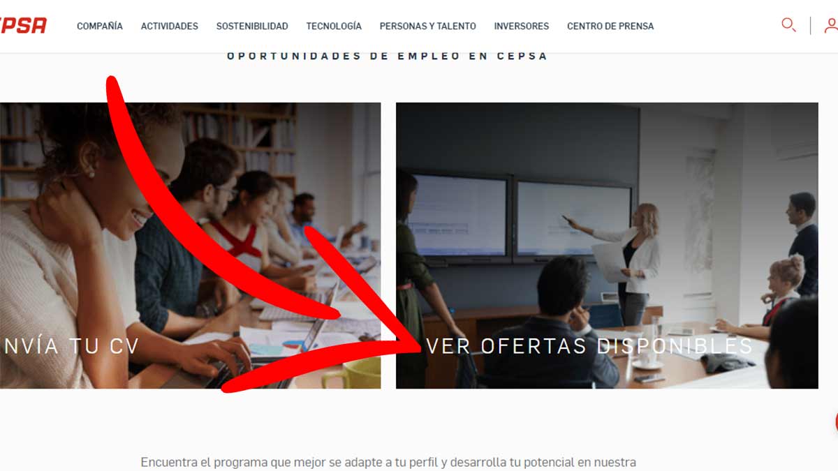 Para ver las ofertas de empleo vacantes de Cepsa tienes que acceder a su portal de empleo, desplazarte hacia la mitad de la página y seleccionar el cuadro que aparece en la parte derecha que dice ‘Ver ofertas disponibles’.