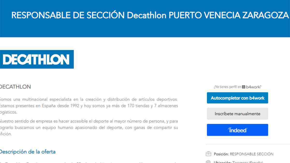 Muchos de estos puestos de trabajo son contratos temporales con motivo de la campaña de Navidad. En cuanto al tipo de jornada, predominan aquellos a tiempo parcial destinados a reforzar algunos puestos de la plantilla. Estás son las últimas ofertas de trabajo en Decathlon que podrás encontrar en su portal web: