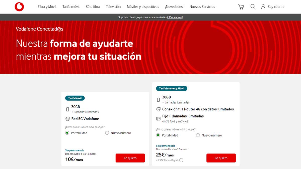 - Un contrato de 30 gigas de internet y llamadas ilimitadas por un precio de 10 euros al mes. Con acceso a la red de 5G de Vodafone y sin permanencia. En el caso de renovar la contratación, el trámite debe hacerse cada doce meses.