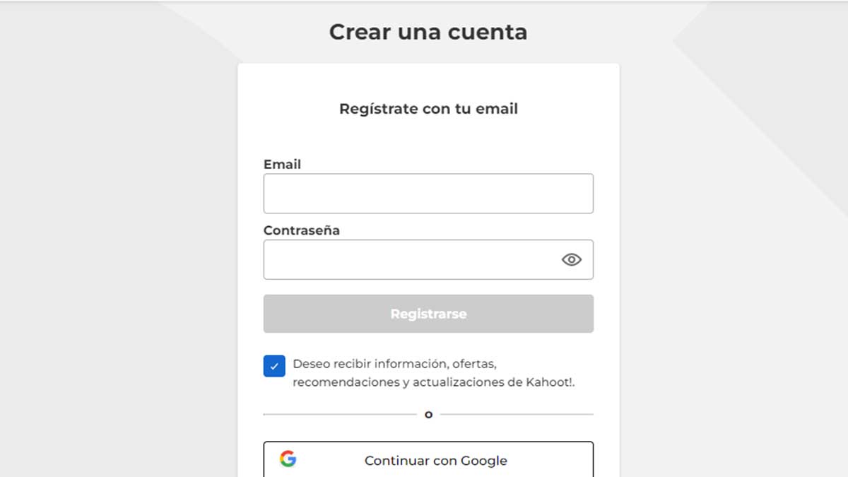 Para realizar un Kahoot lo primero que hay que hacer es registrarse en la plataforma con una cuenta de correo electrónico y un usuario.