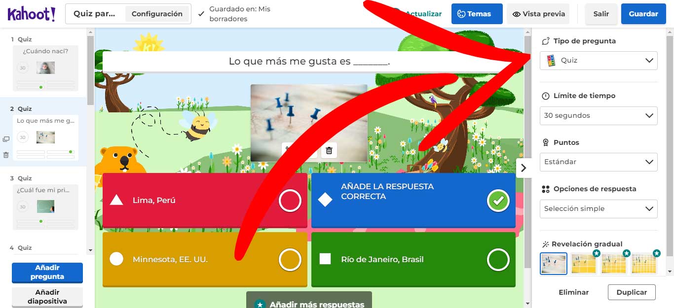 Además de cambiar las preguntas y respuestas, la herramienta permite elegir el tipo de opciones de repuesta, cómo quieres que aparezca en la pantalla y el límite de tiempo para contestar.